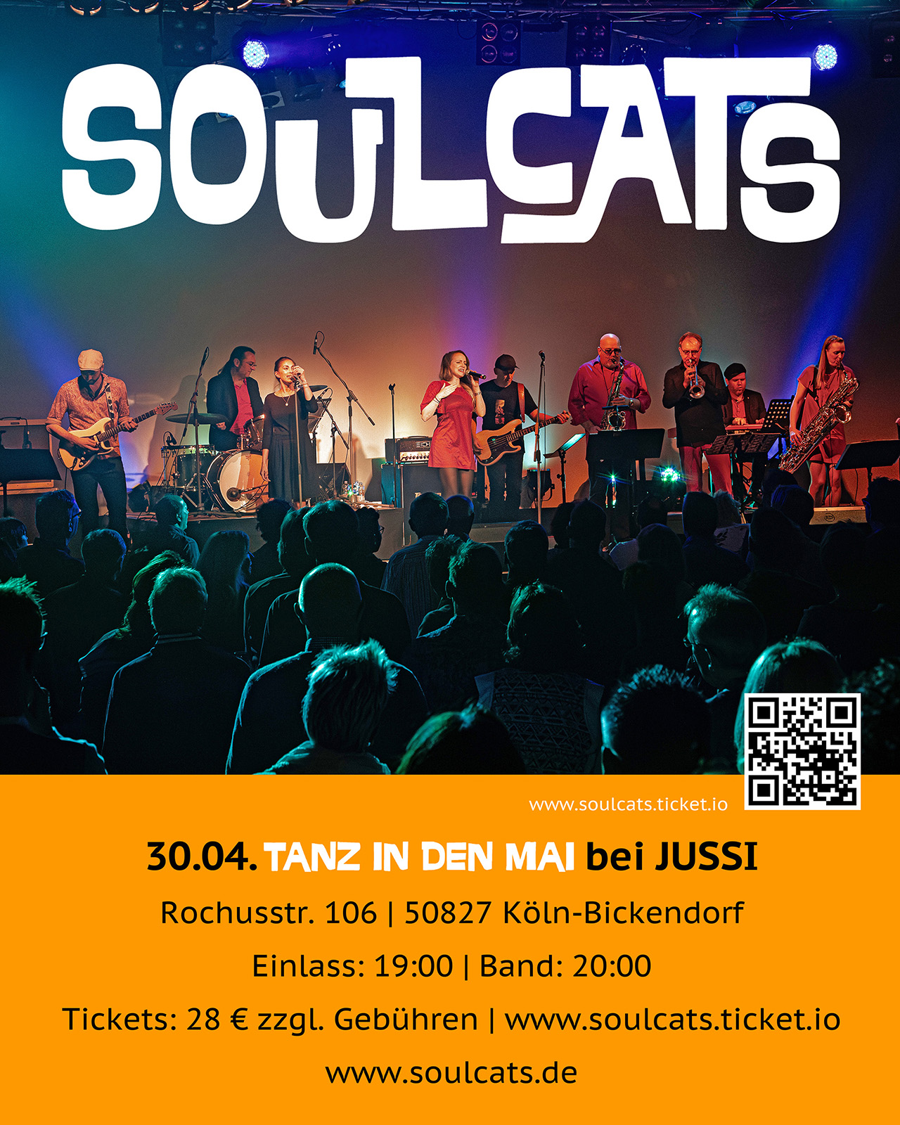 Die SOULCATS spielen Soulclassics zum Abheben. Musik von Amy Winehouse, James Brown, Marvin Gaye, Stevie Wonder … kein cooler Soulhit ist vor Kölns All Star Funk & Soul Band sicher. In 9-köpfiger Besetzung begeistern sie ihr Publikum mit unnachahmlicher Spielfreude, fetten Beats, funky Bläsern und exquisiten vocals. Wer handgespielte Instrumente und feinen Retro-Soulsound liebt ist hier richtig. Sie nehmen sich die Unverfrorenheit von Funk und Soul, verbinden sie mit der Freiheit des Jazz und machen daraus ihr ganz eigenes Ding, weitab von den Untiefen üblicher Tribute- und Coverbands. Am Ende zählt bei den SOULCATS immer nur eins: »We gonna have a funky good time!« Wer hier nicht abfeiert, dem ist auch nicht mehr zu helfen. Und das seit 1989.